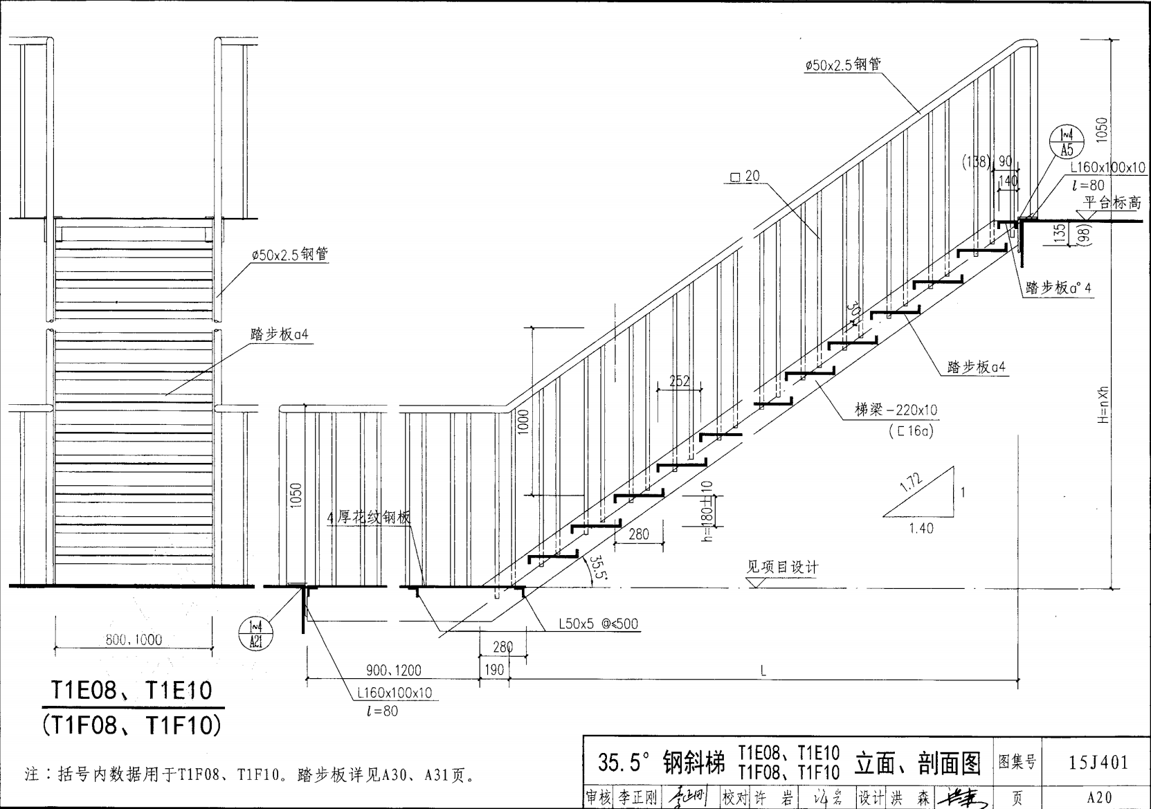 鋼斜梯A | 35.5°(1:1.4) | T1A08 | 800 | -200X10 | 3.60 | a~c |